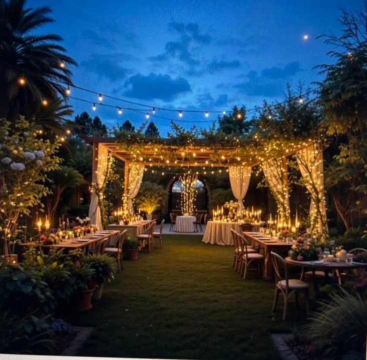 For the reception, think long farm tables under the trees, adorned with garlands of eucalyptus and twinkle lights overhead. Create zones: A lounge area with vintage rugs and pillows for chilling, a dance floor marked by more lights, and a photo booth backed by a lit-up tree. Timing is key – start the party as twilight hits to maximize the lighting effect. I’ve been to receptions where the string lights were synced to music, pulsing softly during slow dances. Pure magic!